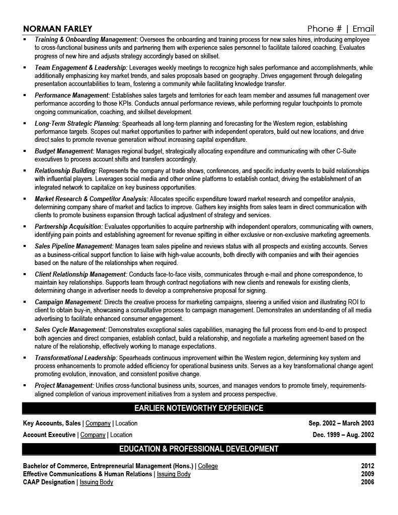 Showcase your sales prowess by organizing your experience into three powerful sections: a compelling role overview that highlights your market expertise, quantifiable achievements that spotlight your revenue wins, and core responsibilities that demonstrate your mastery of client relationships and campaign management.