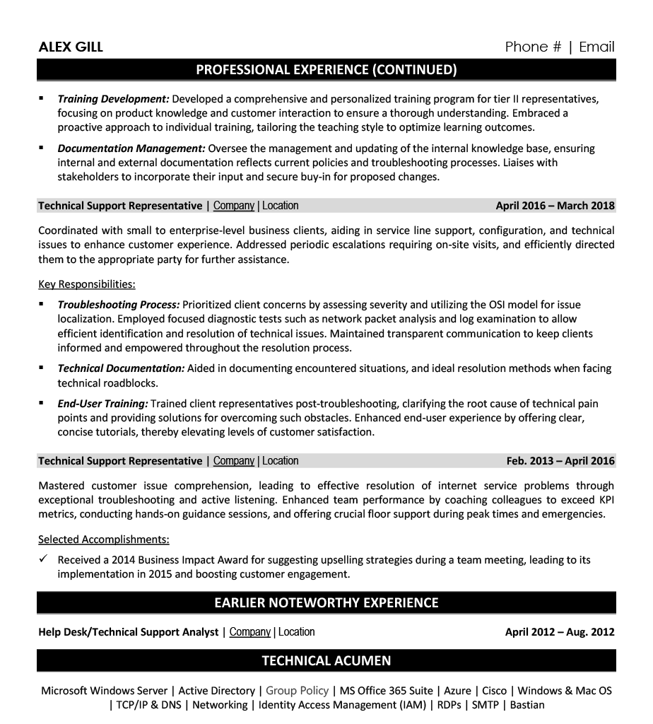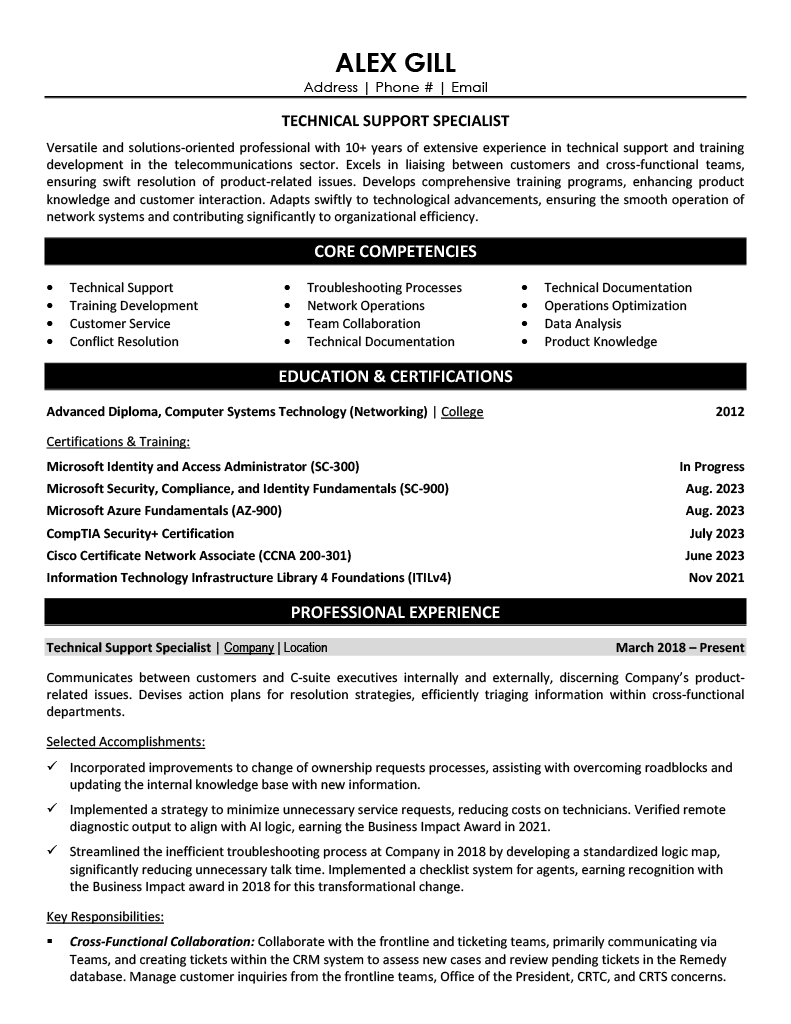 Leverage your academic training, technical certifications, and hands-on experience to create a powerful skills section that showcases your ability to provide excellent technical support and customer service.