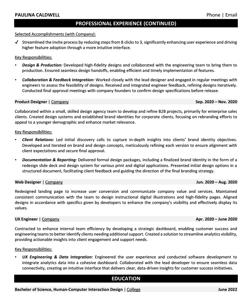 Transform your academic experience into compelling content by highlighting UX/UI coursework, design thinking methodologies, and standout portfolio projects that demonstrate your evolution as a designer.