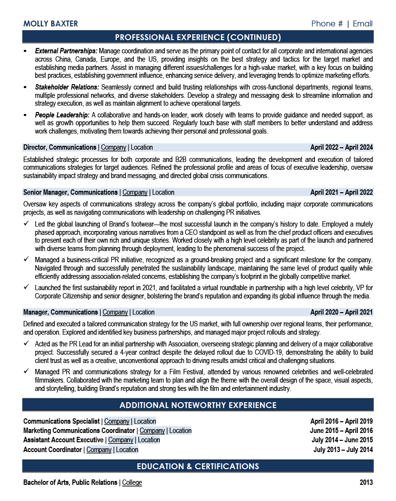 A tailored resume not only helps you navigate through ATS systems by incorporating role-specific keywords, but it also demonstrates to hiring managers that your communication expertise, campaign successes, and media relationships align perfectly with their organization's needs.