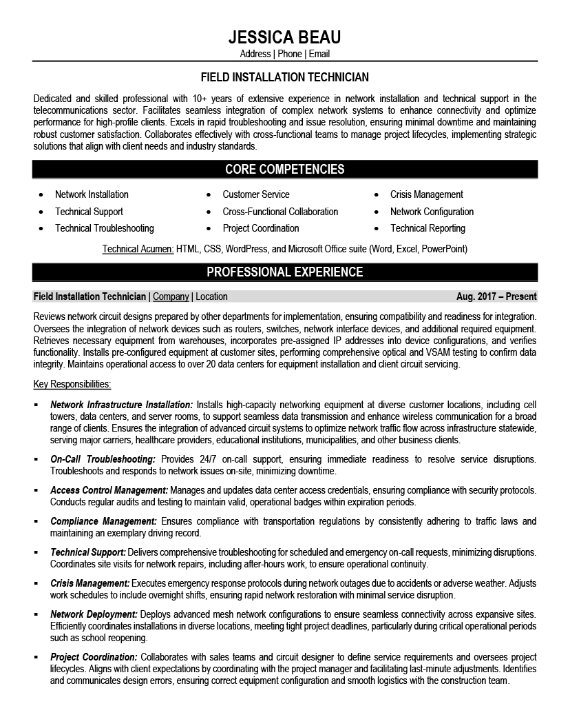 Transform your academic training, technical certifications, and hands-on experience into a powerful skills section that showcases your readiness to tackle real-world field service challenges.