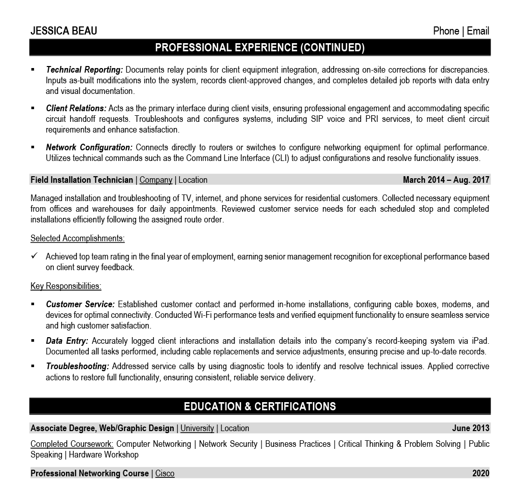 Let's face it - trying to capture all your hands-on expertise, technical certifications, and customer service wins in a single document can feel like troubleshooting a complex network issue without any diagnostic tools.